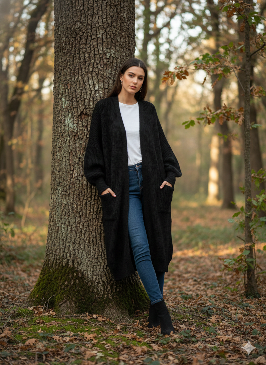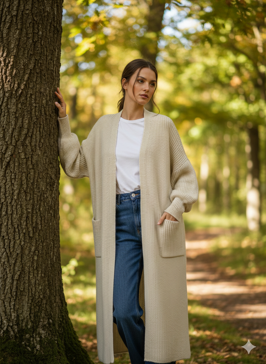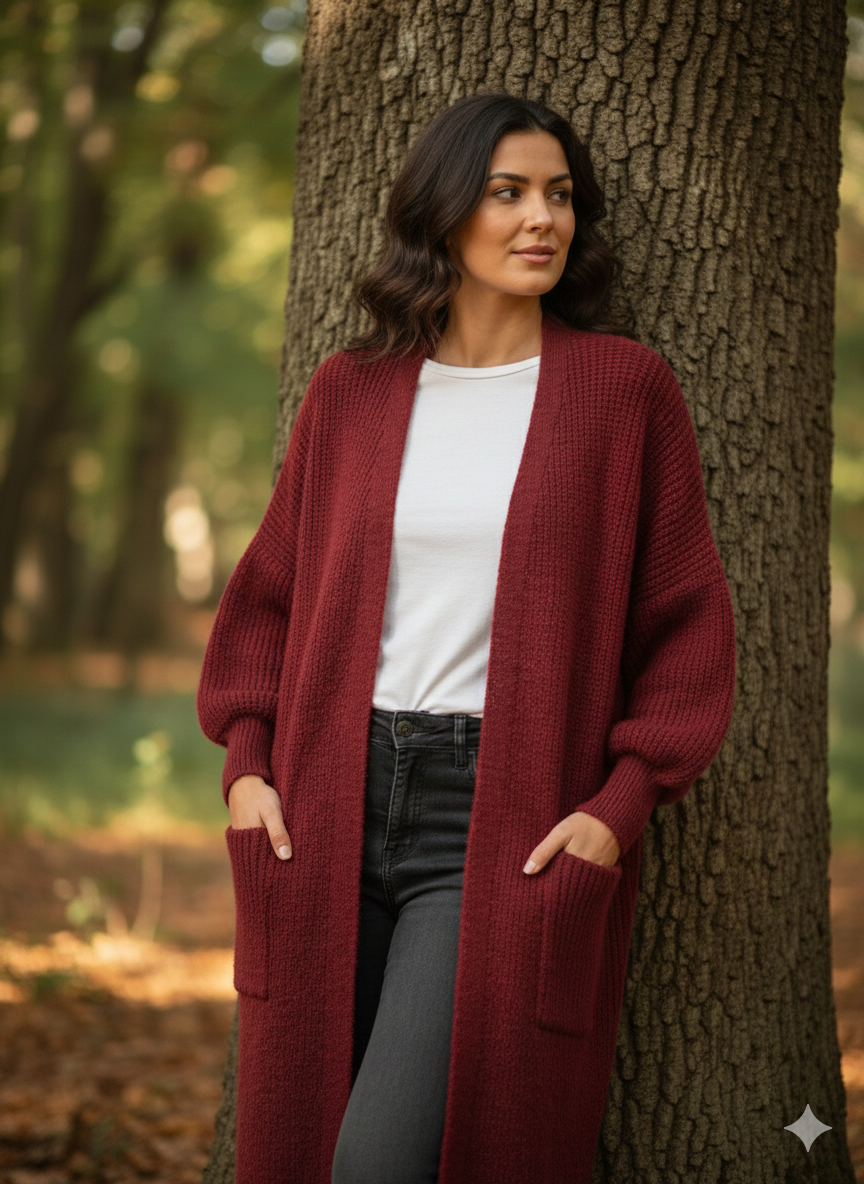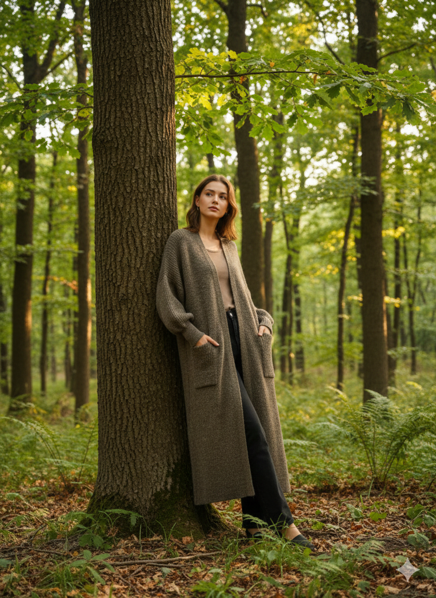 Doğal yünün sıcaklığını zarif dökümlü tasarımla buluşturan hırkamız, gardırobunuzun vazgeçilmez parçası olmaya aday. Yün karışımı kumaşı ve özenle tasarlanmış dökümlü kesimiyle hem rahat hem de şık görünmenizi sağlar.